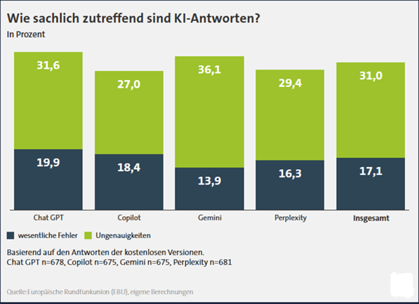 Außerdem hat ein Zusammenschluss mehrerer öffentlich-rechtlicher Sender aus über 50 Ländern die Zuverlässigkeit verschiedener KI-Tools untersucht. Betrachtet man nur die reine Korrektheit der Antworten, ergeben sich dabei folgende Werte:
